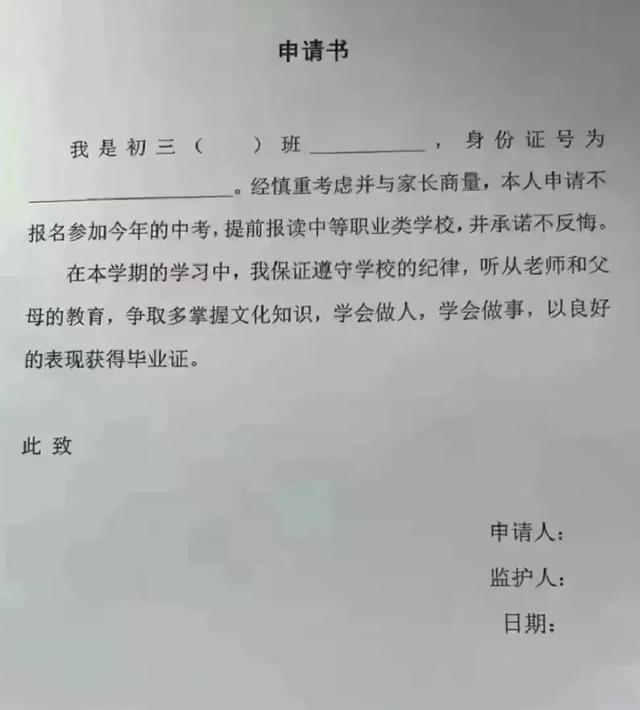 - 看到一位网友发文称看到了某地初三学生的“分流申请表”,表中写道学生申请不参加中考,并且提前报读中等职业类学校不反悔。对此这位网友以及其他网友都给出了这是学校为了提高“升学率(普高率)”而故意逼“学渣”放弃参加中考的评论。有没有这种可能呢?说...