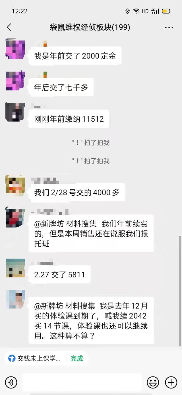 3月9日,她又在袋鼠潜能给女儿报了10个月托班课程,缴纳了37000多元。没想到第二天下午,她就收到了机构课程班主任在课程群里的发布的停课通知。