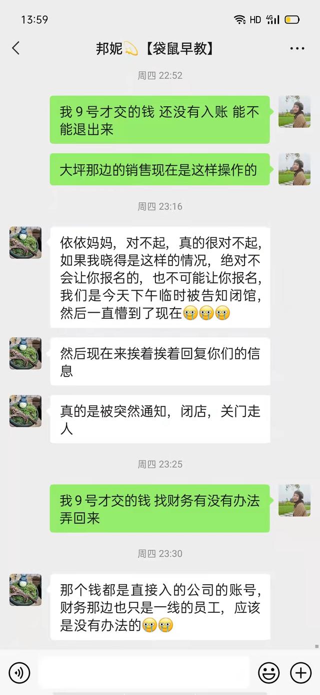 接到通知后,林伶立即联系此前接触过的袋鼠潜能课程老师、销售,直到3月10日晚上10时左右,工作人员才回复她称,他们也是当天下课后临时被学校通知不用再继续上班了。