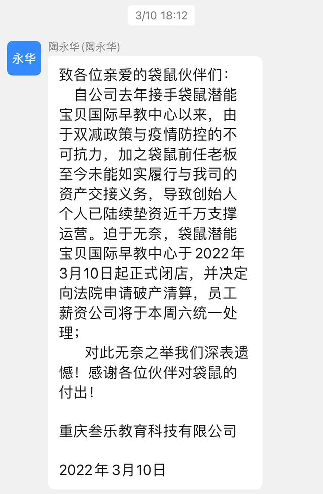 重庆叁乐教育科技有限公司3月10日向家长出具的通知中称,自公司去年接手袋鼠潜能宝贝国际早教中心以来,由于双减政策与疫情防控的不可抗力,加之袋鼠潜能前任老板至今未能如实履行与重庆叁乐教育科技有限公司的资产交接义务,导致公司股东已陆续垫资近千万支撑运营。却仍旧无法挽回公司亏损严重的局面。